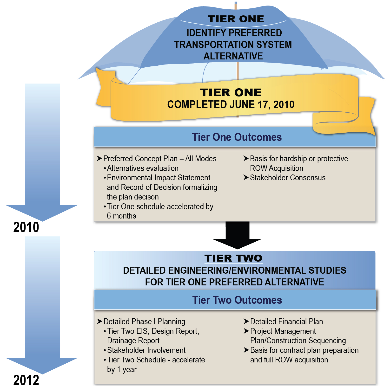 Tier Two is currently underway and builds on Tier One with detailed engineering and environmental studies to refine design within the preferred corridor. These details are necessary to better determine the extent of the project footprint, and measures to avoid, minimize or mitigate environmental effects. Project documentation from Tier Two will include the Tier Two Draft and Final Environmental Impact Statement (EIS), Preliminary Geometry, Design Report, Drainage Report, Financial Plan, Project Management Plan and continued stakeholder involvement. These documents will provide the basis for contract plan preparation and full ROW acquisition to advance construction. The Tier Two Schedule has been accelerated by 1 year